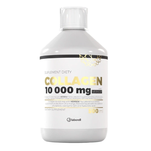 - LABORELL Collagen 10 000 mg to płynny suplement diety z wysoką dawką kolagenu VERISOL, wzbogacony o witaminę C, biotynę, B12, koenzym Q10 i kwas hialuronowy. Wspiera skórę, włosy, paznokcie i stawy. Smak mango, gotowy do picia – bez kapsułek i proszków.