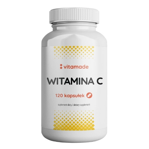- VITAMADE Vitamin C 120 kaps to suplement diety w kapsułkach zawierający aż 1000 mg witaminy C, który wspiera odporność, redukuje zmęczenie i chroni komórki przed stresem oksydacyjnym. Pomaga również w produkcji kolagenu, dbając o zdrowie skóry i kości.