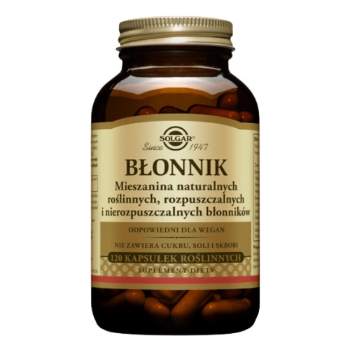 - SOLGAR Błonnik to suplement diety łączący frakcje błonnika rozpuszczalnego i nierozpuszczalnego, pozyskanego z naturalnych źródeł roślinnych. Produkt wspiera uzupełnienie codziennej diety w błonnik i jest odpowiedni dla osób na diecie wegańskiej.