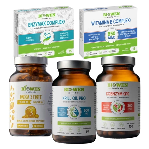 BIOWEN Omega 3 Forte 1000mg 90 kaps + Krill Oil Pro Olej z Kryla 90 kaps + Koenzym Q10 100mg 100 kaps + B-Complex 15 kaps + Enzymax Complex+ 15 kaps