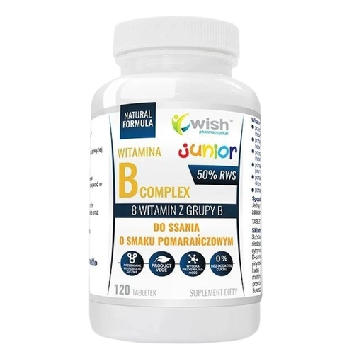 - WISH Witamina B Complex Junior to suplement diety dla dzieci od 10. roku życia, dostarczający kompleks witamin B w formie smacznych tabletek do ssania wspierających układ nerwowy i koncentrację.