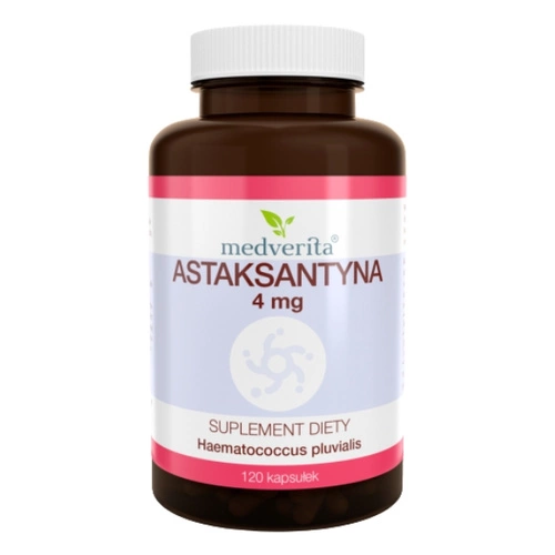 - MEDVERITA Astaksantyna 4 mg 120 kaps to naturalny suplement diety pozyskiwany z mikroalg Haematococcus pluvialis, wspierający ochronę komórek przed stresem oksydacyjnym. Produkt w formie kapsułek Softgel charakteryzuje się wysoką przyswajalnością.
