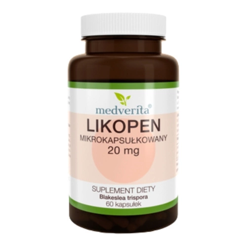 - MEDVERITA Likopen 20 mg 60 kaps to silny antyoksydant (20 mg likopenu), który wspiera ochronę komórek przed wolnymi rodnikami, a dzięki dodatkowi błonnika akacjowego dba o zdrowie jelit.