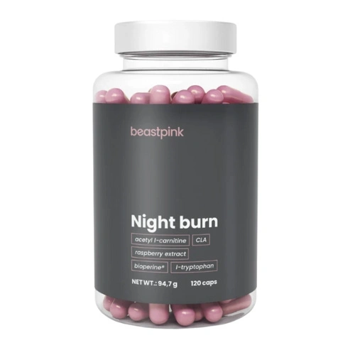 - GymBeam Night Burn to spalacz tłuszczu bez kofeiny, który wspiera redukcję wagi i przyspiesza metabolizm podczas nocnego odpoczynku. Dzięki zawartości l-tryptofanu produkt może korzystnie wpływać na jakość snu, pozwalając na modelowanie sylwetki.