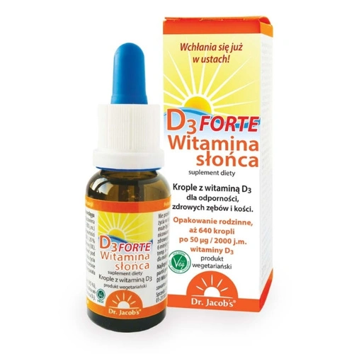 - DR. JACOB'S Witamina D3 Forte to wysokiej dawki krople wspierające odporność, zdrowe kości i mięśnie. Szybko wchłaniają się w ustach i są idealne dla dorosłych i seniorów.