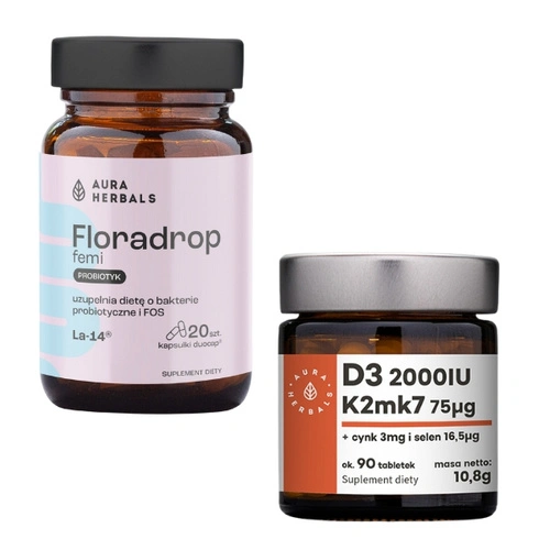 AURA HERBALS Witamina D3 2000IU + K2MK7 + Cynk + Selen 90 tabs + AURA HERBALS Floradrop Femi Probiotyk 20 kaps