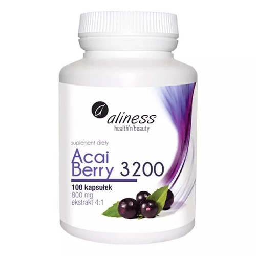 Acai Berry 3200 to suplement diety, który w jednej kapsułce zawiera aż 800 mg czystego ekstraktu z owoców Acai. Ilość ta odpowiada 3200 mg owoców tejże rośliny. Ponadto preparat zawiera acerolę będącą naturalną witaminą C, a także chrom. Acai Berry 3200 marki Aliness jest jedynym preparatem na obecnym rynku suplementacji, który zawiera aż tak potężną dawkę ekstraktu z acai. Jest to także produkt charakteryzujący się niesamowitą wydajnością. Jedno opakowanie wystarczy Ci na 50-100 dni suplementacji.