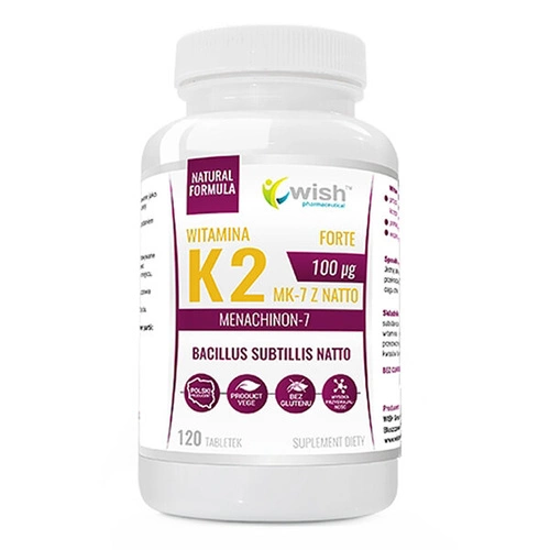 Suplement diety K2 MK-7 z natto WISH Pharmaceutical zawiera naturalną witaminę K2 w dawce aż 100 mcg. Ponadto produkt jest bogaty w MK-7 z natto. Preparat w dawce forte dostępny jest w postaci tabletek powlekanych.