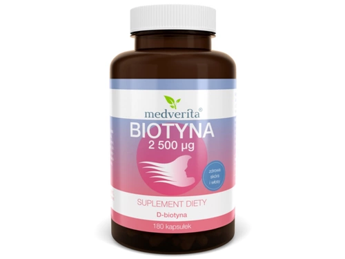 Opisywany suplement diety marki Medverita to bogate źródło biotyny, która nazywana jest także witaminą B7 lub witaminą H. To organiczny związek chemiczny, który bierze udział w wielu procesach zachodzących w ludzkim organizmie. Biotyna jest rozpuszczalną w wodzie witaminą z grupy B. Doskonale wpływa na wiele aspektów zdrowotnych, aczkolwiek głównie znana jest z tego, jak dobry wpływ ma na włosy, skórę i paznokcie. Nie bez powodu została nazwana witaminą piękna. Opisywany produkt dostępny jest w wygodnej formie kapsułek powlekanych.
