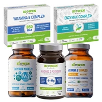 BIOWEN Taurynian Magnezu 100 kaps + Witamina B-Complex 90 kaps + Magnez 4X z Potasem 100 kaps + B-Complex 15 kaps + Enzymax Complex+ 15 kaps